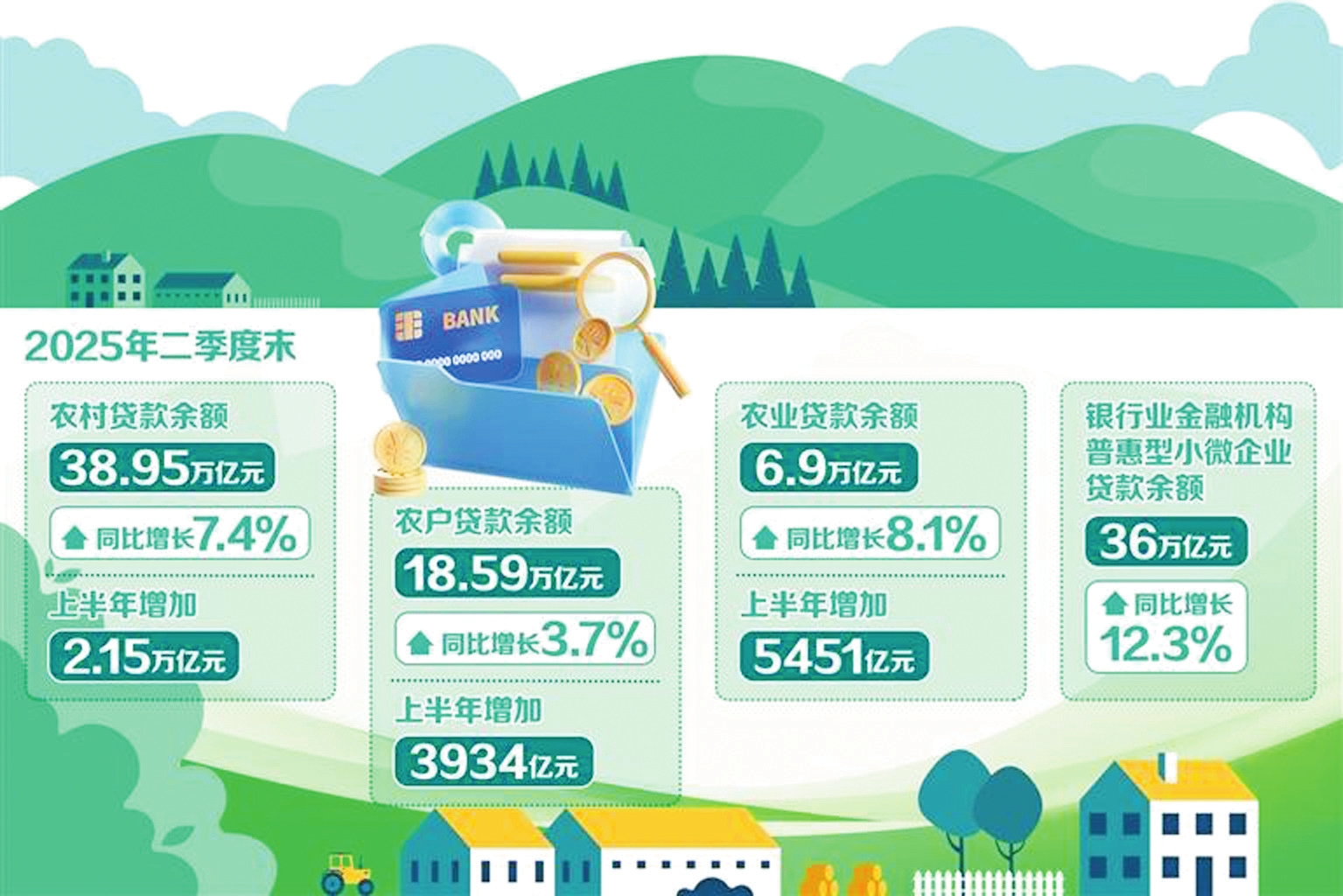總的來看,今年二季度涉農(nóng)金融投放增量擴(kuò)面。2025年二季度金融機(jī)構(gòu)貸款投向統(tǒng)計(jì)報(bào)告顯示,2025年二季度末,農(nóng)村貸款余額38.95萬億元,同比增長7.4%,上半年增加2.15萬億元。農(nóng)戶貸款余額18.59萬億元,同比增長3.7%,上半年增加3934億元。農(nóng)業(yè)貸款余額6.9萬億元,同比增長8.1%,上半年增加5451億元。