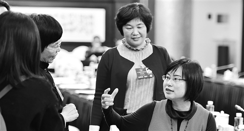 3月11日,人大廣東代表團(tuán)在駐地舉行分組會(huì)議。全國(guó)人大代表龍芳(右一)、李淑明(右二)與同團(tuán)代表在討論“一帶一路”戰(zhàn)略對(duì)廣東企業(yè)“走出去”產(chǎn)生的影響。本報(bào)記者 李景錄攝