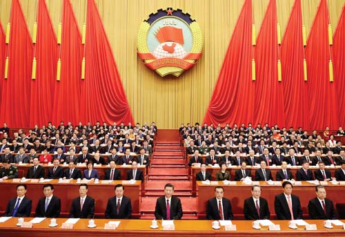 3 月15 日,中國人民政治協(xié)商會議第十三屆全國委員會第一次會議在北京閉幕。這是習近平、李克強、張德江、俞正聲、張高麗、栗戰(zhàn)書、王滬寧、趙樂際、韓正等在主席臺就座。新華社記者 丁 林 攝