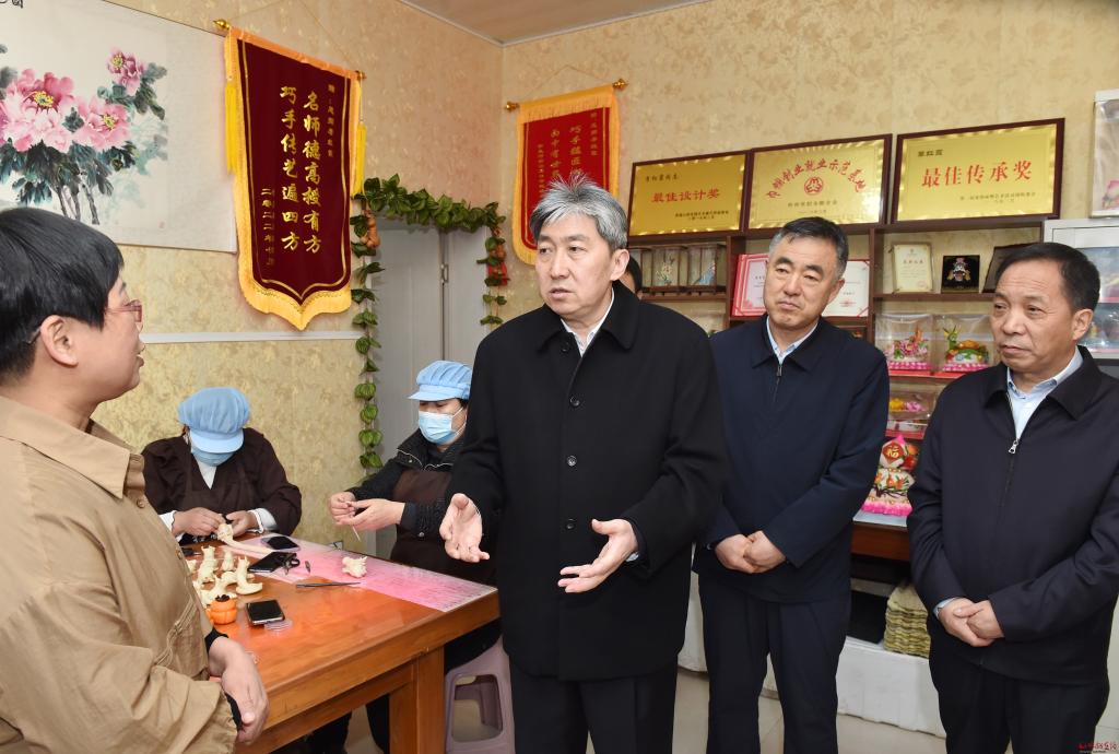 非遺傳承人李紅霞主要從事面塑工藝品和花饃制作與銷售工作,由她創(chuàng)辦的紅霞鄉(xiāng)情守藝坊,吸收了當(dāng)?shù)責(zé)o業(yè)和老弱病殘人員20余人。走訪中,朱曉東來到李紅霞處,詳細(xì)了解面塑的歷史、現(xiàn)狀、未來發(fā)展方向,詢問她在經(jīng)營、培訓(xùn)、傳承中存在的困難和問題。朱曉東指出,非遺傳承人是非物質(zhì)文化遺產(chǎn)重要的承載者和傳承者,在傳統(tǒng)文化和民間藝術(shù)的延續(xù)發(fā)展中發(fā)揮著關(guān)鍵性作用。要積極主動為傳承人搭建展示推廣平臺,讓珍貴的傳統(tǒng)技藝有序、有效傳承下去。希望傳承人進(jìn)一步堅定文化自信,結(jié)合時代發(fā)展的特點,不斷推陳出新,做好產(chǎn)品研發(fā)和創(chuàng)新,注重實用價值轉(zhuǎn)化,在宣傳、品質(zhì)、特色和工業(yè)化、標(biāo)準(zhǔn)化方面下功夫,開展好授徒傳藝,賦予非遺項目新的活力,將“小花饃”產(chǎn)業(yè)做大做強(qiáng)。
