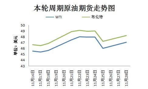 本輪計(jì)價(jià)周期內(nèi),國際原油價(jià)格呈現(xiàn)先漲后跌再漲態(tài)勢。截至11月28日收盤,當(dāng)日,美國WTI原油期貨漲1.02美元,報(bào)收47.08美元/桶;布倫特原油期貨漲1.00美元,報(bào)收48.24美元/桶。