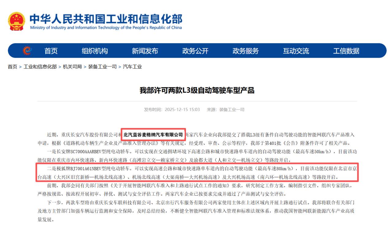 12月15日,北汽集團旗下極狐阿爾法S(L3版)正式獲批工業(yè)和信息化部自動駕駛車型產(chǎn)品準(zhǔn)入許可,即將在北京市限定區(qū)域內(nèi)開展L3級有條件自動駕駛上路通行試點。這標(biāo)志著我國自動駕駛技術(shù)發(fā)展逐步走向量產(chǎn)應(yīng)用階段,也是北汽集團在自動駕駛領(lǐng)域從技術(shù)驗證階段邁向量產(chǎn)應(yīng)用階段的重要里程碑。