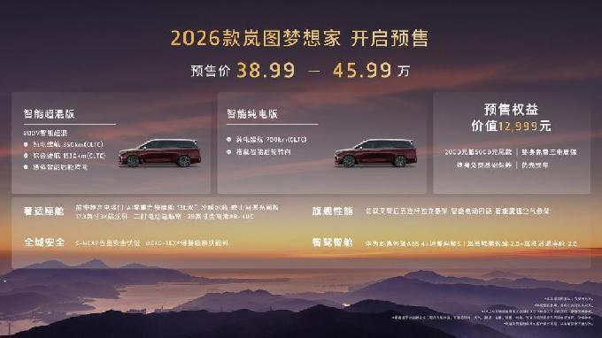 8月29日,第二十八屆成都國際汽車展覽會盛大開幕。全面煥新升級的“新時(shí)代旗艦MPV”2026款嵐圖夢想家預(yù)售亮相。本次新車共推出智能超混版和智能純電版兩個(gè)動(dòng)力版本,預(yù)售價(jià)為38.99萬-45.99萬,同步推出了價(jià)值超萬元的多項(xiàng)重磅權(quán)益,包括2000元抵5000元尾款的膨脹金,終身免費(fèi)三電質(zhì)保、終身免費(fèi)基礎(chǔ)保養(yǎng)和優(yōu)先交付提車。9月1日起,2026款嵐圖夢想家展車、試駕車將陸續(xù)到店,消費(fèi)者可以進(jìn)店親自體驗(yàn)新車的獨(dú)特魅力。