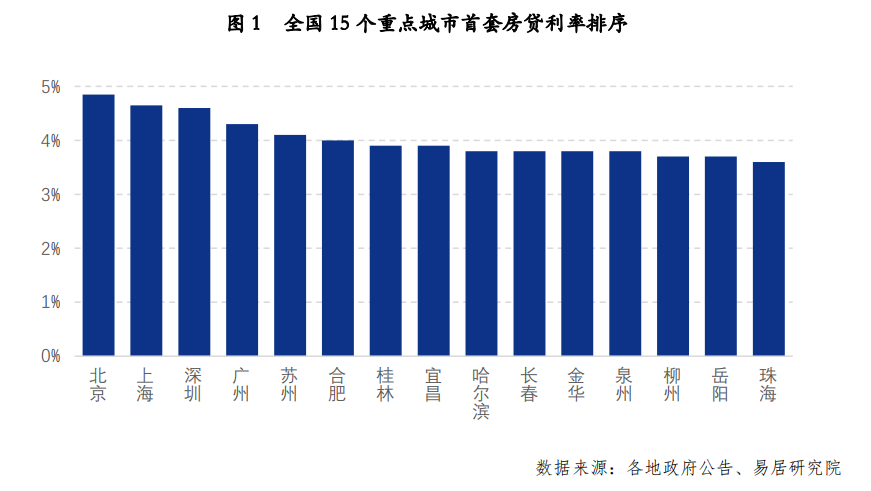 但具體看這15個城市的排序情況,各城市的實(shí)際首套房貸利率呈現(xiàn)了較大差異。其中北上深廣四個一線城市房貸利率最高,分別為4.85%、4.65%、4.60%和4.30%。而其他城市均低 4.1%的水平。易居房地產(chǎn)研究院統(tǒng)計顯示,有9個城市房貸利率低于4%的水平,包括弱二線城市和很多三四線城市。
