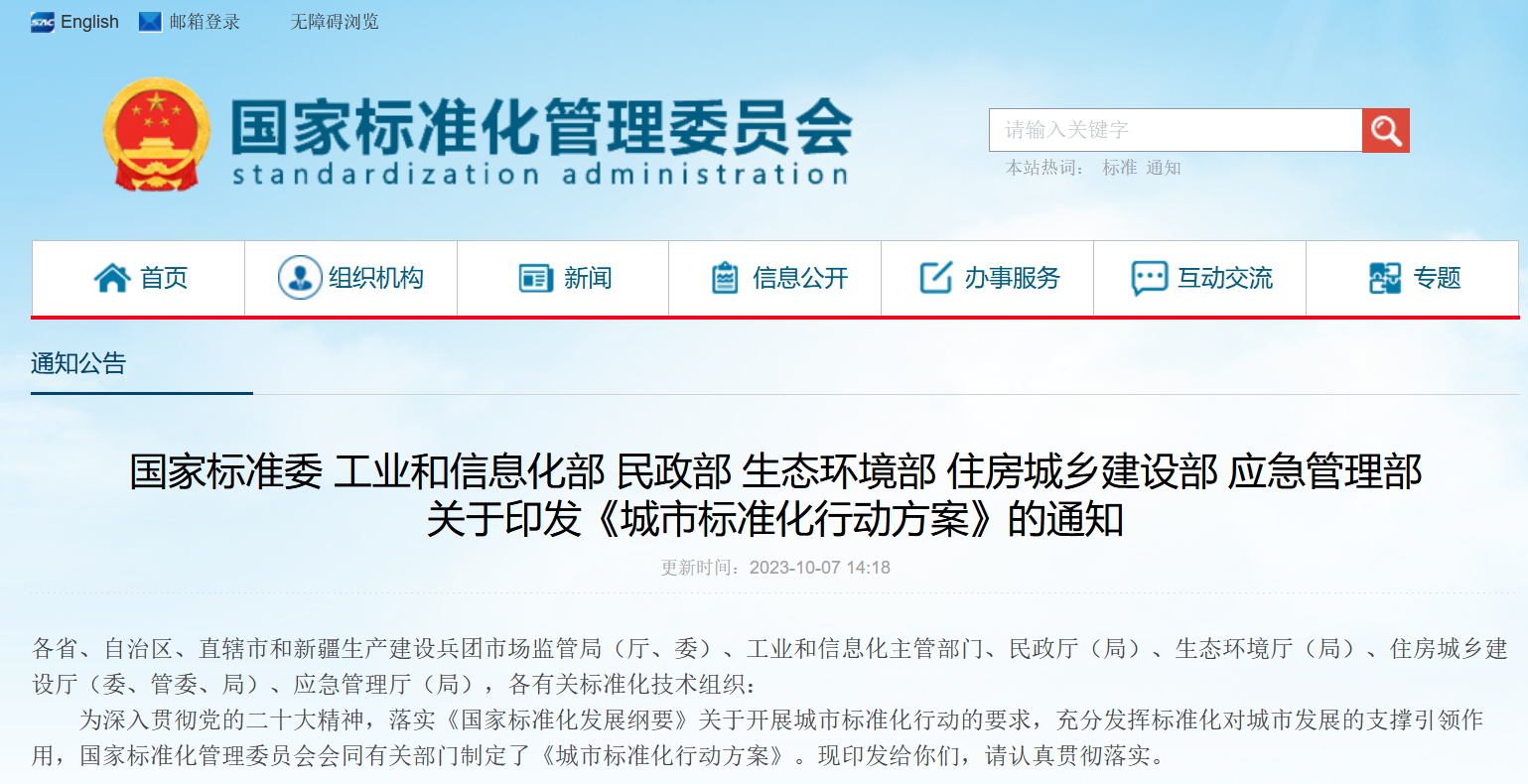 央廣網(wǎng)北京10月8日消息 據(jù)國家標(biāo)準(zhǔn)化管理委員會網(wǎng)站消息,為落實《國家標(biāo)準(zhǔn)化發(fā)展綱要》關(guān)于開展城市標(biāo)準(zhǔn)化行動的要求,充分發(fā)揮標(biāo)準(zhǔn)化對城市發(fā)展的支撐引領(lǐng)作用,近日,國家標(biāo)準(zhǔn)化管理委員會會同工業(yè)和信息化部、民政部、生態(tài)環(huán)境部、住房城鄉(xiāng)建設(shè)部、應(yīng)急管理部制定了《城市標(biāo)準(zhǔn)化行動方案》(以下簡稱《行動方案》)。