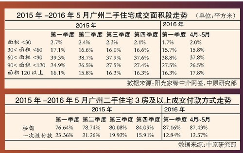 中原研究部監(jiān)測的陽光家緣數(shù)據(jù)顯示,120平方米的物業(yè)在2016年4月~5月份成交占比較第一季度提升了1.5個百分點,對于打算生二孩的老百姓來說,一方面,人口增多,需要提前購置大房;另一方面,在低利率的時代,買房不僅可以使資產(chǎn)保值增值,對抗通脹,也能利用低利率政策減少購房成本支出。在2016年成交的3房及以上的物業(yè)付款方式來看,按揭貸款的占比呈一路走高的態(tài)勢,2016年1月~5月份占比在87%的水平,較2015年第三季度多了7個百分點左右。