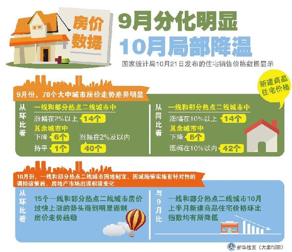 新華社北京10月21日電(記者王希)國家統(tǒng)計局21日發(fā)布的住宅銷售價格數(shù)據(jù)顯示,9月份70個大中城市房價分化明顯,10月份一線和部分熱點二線城市有針對性地實施調(diào)控政策,房地產(chǎn)市場明顯降溫。