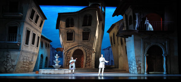 7月13日當(dāng)晚,隨著歌劇指揮莫蘭迪引領(lǐng)國(guó)家大劇院管弦樂團(tuán)奏出《塞維利亞理發(fā)師》膾炙人口的序曲旋律,大幕拉開,由著名舞臺(tái)設(shè)計(jì)師張武設(shè)計(jì)的“高迪建筑風(fēng)格”的塞維利亞小鎮(zhèn)展現(xiàn)在觀眾面前。