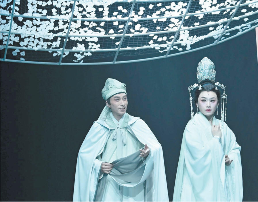 舞臺上,《帝女花》長演不衰,多個劇團進行了重塑排演,其中不乏創(chuàng)新求變的探索。桃花源粵劇工作舍于2022年制作了《帝女花》65周年巡演版,并細分為管弦光影版、學(xué)生戲臺版等多個不同版本,激發(fā)觀眾的思考與想象。2024年,廣東粵劇院推出曾小敏、文汝清主演的小劇場粵劇《帝女花·一念》,在保留經(jīng)典唱段的基礎(chǔ)上做簡化,嘗試注入新的時代氣息。劇中,曾小敏不僅飾演了戴花冠、著宮裝的長平公主,還扮演了穿越古今的素衣女子,引領(lǐng)觀眾穿越古今,體驗長平公主的前世今生。