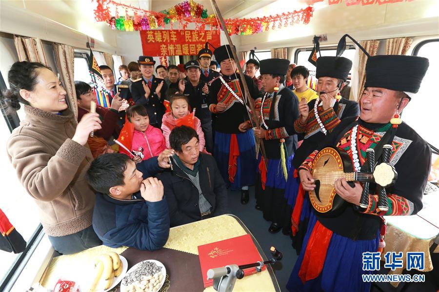 2月1日,彝族藝術(shù)家在K165次列車上為旅客表演。當日,在西安鐵路局西安至昆明的K165次列車上,四川美姑縣原生態(tài)畢摩樂隊與西安客運段職工民樂小分隊聯(lián)合舉辦“英雄列車民族之聲親情溫暖回家路”音樂會,畢摩樂隊用口弦、哈門、木葉、瑪布等彝族民間樂器演奏的音樂為返鄉(xiāng)過年的旅客提前送上新年祝福。民間藝術(shù)家和列車乘務(wù)員還為旅客們送上“福”字、春聯(lián)。新華社發(fā)