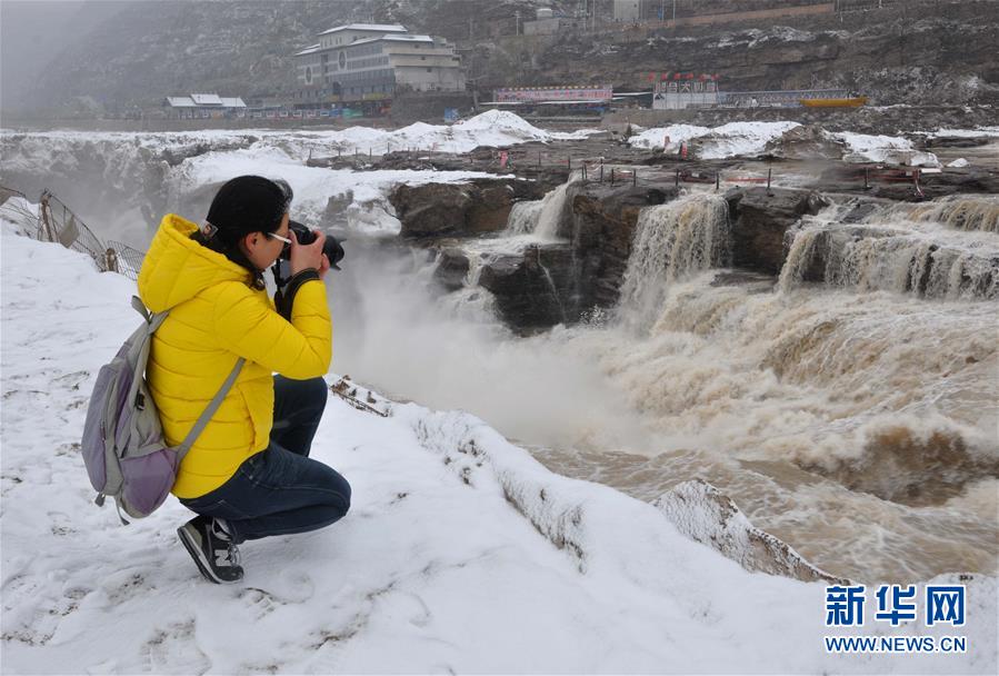 3月9日,一名游客在山西吉縣拍攝飛雪中的黃河壺口瀑布。當日,受倒春寒天氣影響,位于山西吉縣和陜西宜川縣交界的黃河壺口瀑布迎來雨雪天氣,奔流的壺口瀑布在白雪的映襯下更顯壯美。新華社發(fā)(呂桂明 攝)