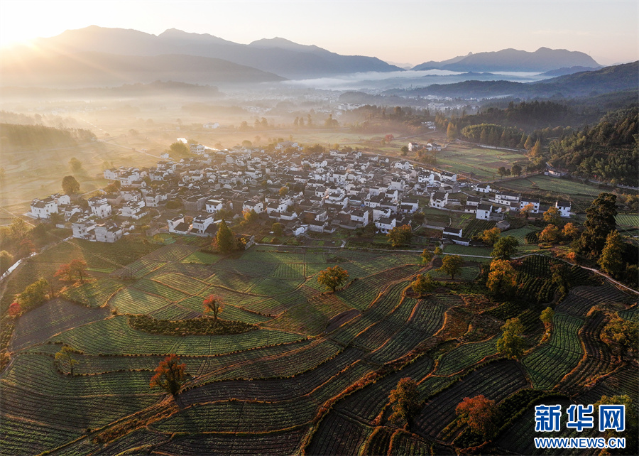 11月1日,在安徽省黃山市黟縣宏村鎮(zhèn)盧村拍攝的秋日晨景。