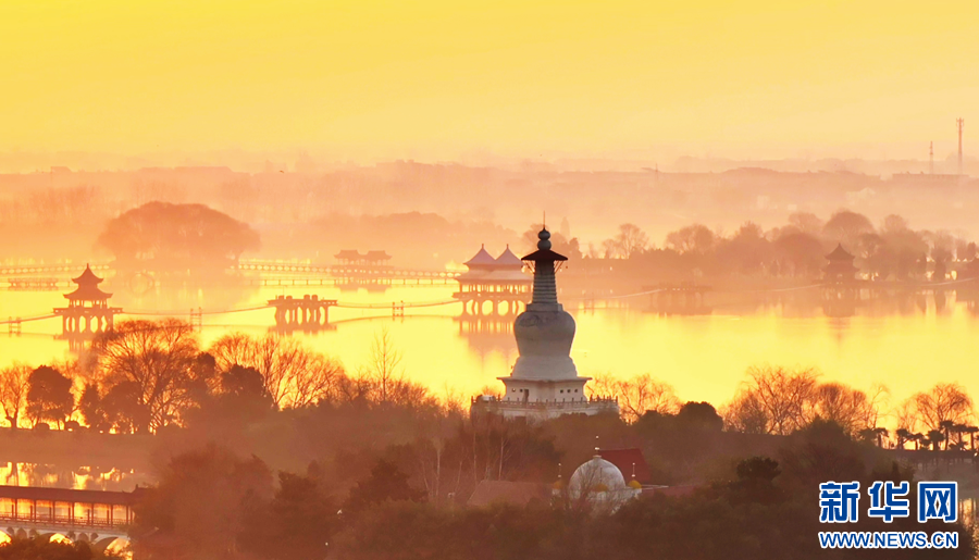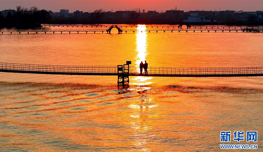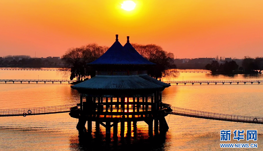 近日,在安徽省潁上縣八里河風景區(qū),隨著紅日冉冉升起,晨曦映照在水面上,水光瀲滟,交相輝映,宛如油畫一般,盡顯光影之美。新華網(wǎng)發(fā)(徐紅梅 攝)