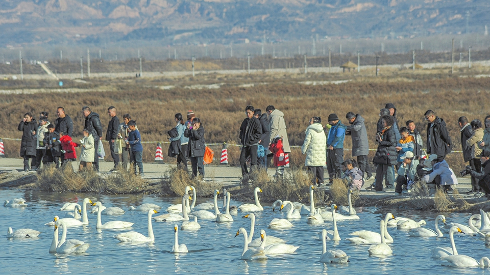 1月12日,人們在運城鹽湖近距離觀賞野生大天鵝。入冬以來,運城的千年鹽湖迎來一群特殊“訪客”,一大批天鵝在此棲息越冬,鹽湖搖身一變成了“天鵝湖”,與周邊的秀美山色相映成趣,構(gòu)成一幅絕美生態(tài)畫卷,讓千年鹽湖煥發(fā)出別樣生機。