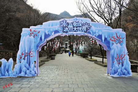 五老峰景區(qū)錦繡谷,工作人員借助天然溪流形成的冰掛加以人工造冰造型,按照生態(tài)環(huán)保和藝術(shù)創(chuàng)意要求,打造出長(zhǎng)約1公里、單體高3米至10米的彩色冰掛,極具視覺沖擊力。一條條冰掛或垂于崖壁,或懸于樹枝,晶瑩剔透,壯觀雄渾。滿目的玉樹瓊花、銀峰玉柱形成一幅霧凇冰掛奇景,讓人仿佛置身于童話世界。