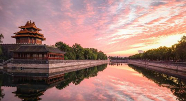 晚霞中的北京故宮東北角樓(手機照片,7月20日攝)。