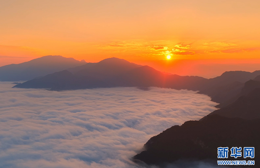 曙光初照,云海翻騰。近日,安徽省池州市石臺縣仙寓山景區(qū)在晨光中展現(xiàn)出一幅壯麗的日出云海畫卷。萬頃云濤在層巒疊嶂間奔涌流動,與朝霞金光交織成景,氣象萬千,蔚為壯觀。(王帆 攝)
