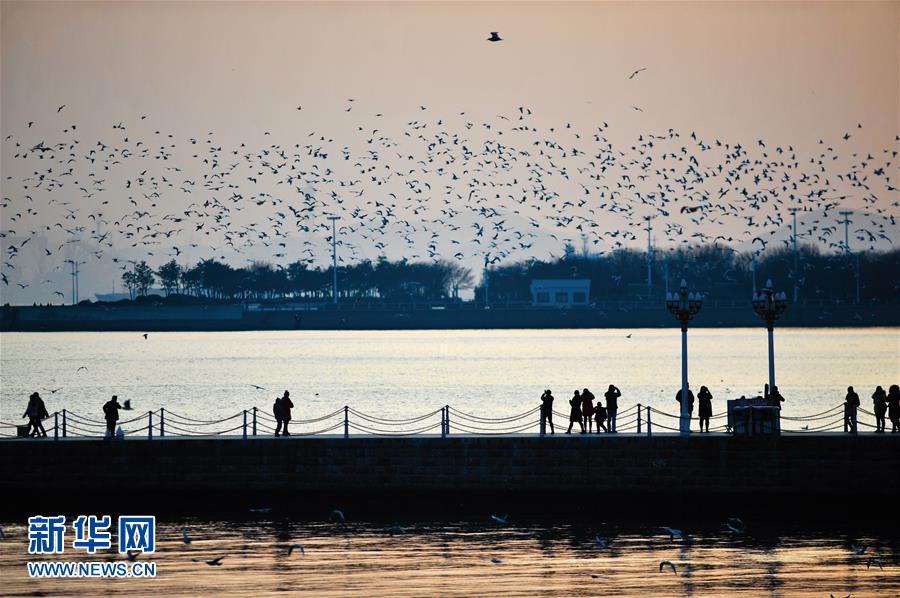 1月10日,水鳥在青島棧橋景區(qū)一帶飛翔。當日,山東省青島市天氣晴好,黃昏時分沿海一帶景色迷人。 新華社發(fā)(王海濱 攝)