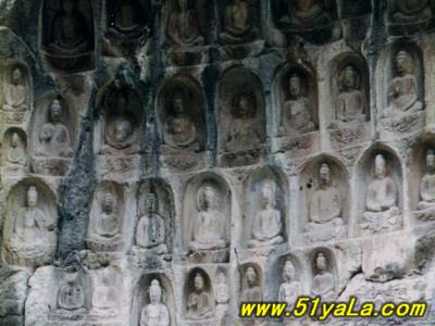 千佛崖在山西霍縣南7.5公里郭莊村山腰。山巒聳峙,山花爛漫,摩崖造像隱現其間。始刻于唐代,宋、元時屢有造鑿,直至明正德五年(1501年)始結束。本尊大佛高約8米,下部刻有唐貞觀以及天寶五年(公元746年)、長慶二年(822年)等題記。千手千眼觀音像高約2米,為元代所造。其余小佛多為三軀一組(一佛二菩薩或一佛二弟子),亦有單佛一龕者,刻工精湛,造型生動,極富民間特色。