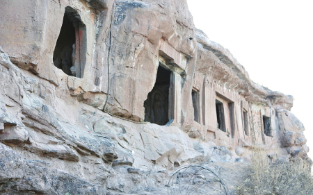 進(jìn)入寺院抬頭仰望,距現(xiàn)地表高約10米的山體上由北向南排列著九座石窟??傮w特征皆平面方形,窟頂上部外立面存有窟檐橡孔。沿山崖堆積的土丘登高看到,每窟面積約為2平方米,四壁垂直,頂部為平頂或略帶弧度。第一、三、五窟門楣雕有火焰紋裝飾,門楣內(nèi)雕飛天或花卉,門兩側(cè)設(shè)方形石柱或八棱束蓮柱。一至六窟平面呈長(zhǎng)方形,平頂,四壁平直;七至九窟呈長(zhǎng)方形,拱券頂;中間一孔入口兩側(cè)還刻有石雕小獸,造型生動(dòng)。9窟中除第8窟為未完工的窟室和第7窟推測(cè)為僧房窟外,余下的窟俱為佛殿窟??邇?nèi)三面石壁上都刻有佛像,設(shè)低壇。四壁三龕,每龕一佛二菩薩或一佛二弟子,造像面相豐潤(rùn)、頤頰飽滿。雖年久失修,風(fēng)化嚴(yán)重,但仍能從中領(lǐng)略幾分豪邁灑脫的大唐風(fēng)韻。三至六窟外壁存摩崖碑3通,均為螭首,碑文漫漶不清。據(jù)摩崖碑上“……歲次丁丑七月辛酉朔十五日乙亥建立”字跡記載,雕造于唐儀鳳二年(公元677年)。