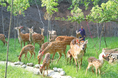 基地采用“公司+基地+合作社+農(nóng)戶”的經(jīng)營(yíng)模式,鼓勵(lì)和扶持農(nóng)戶認(rèn)養(yǎng)梅花鹿和種植農(nóng)作物,并以訂單式回收,確保農(nóng)戶收益。上桑林村村民劉海軍四年前認(rèn)養(yǎng)了兩頭鹿,每年每頭鹿凈增收4000多元?!拔艺J(rèn)養(yǎng)的是公鹿,村里認(rèn)養(yǎng)母鹿的收入更多,畢竟生下的小鹿都是個(gè)人的。還有在基地上班的也不少掙。”