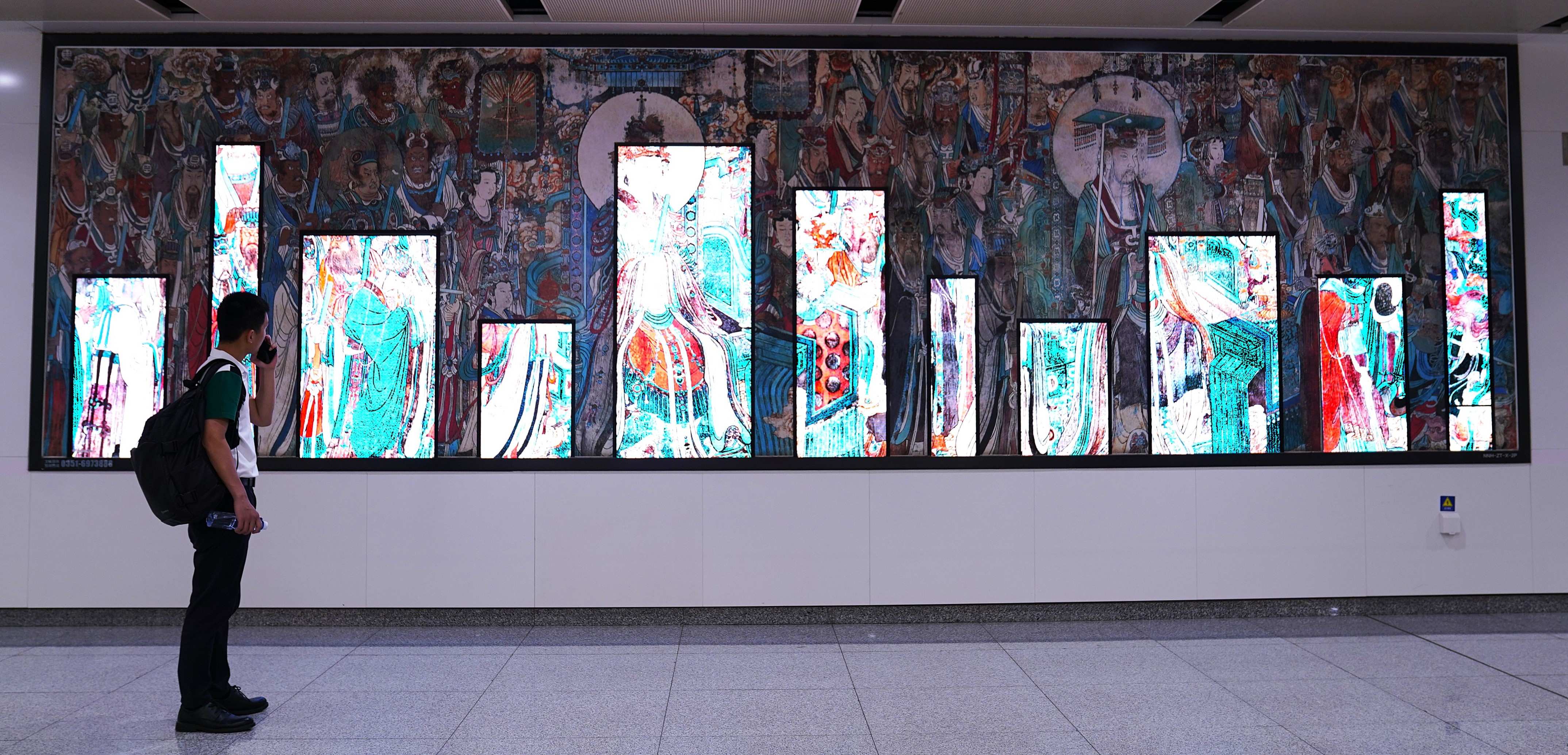 連永樂宮壁畫的絢麗、云岡石窟大佛的莊嚴(yán)、應(yīng)縣木塔的精巧,都被藝術(shù)復(fù)刻在站廳里——等車的間隙,有人會盯著壁畫上的飛天出神,有人會摸著梁思成筆下的古塔紋路發(fā)呆,匆忙的通勤路,忽然就多了份文化的滋養(yǎng)。