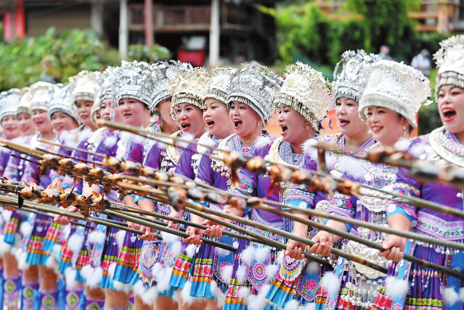 近年來,廣西柳州市融水苗族自治縣充分利用當(dāng)?shù)刭Y源,推動(dòng)漁旅融合發(fā)展,助力鄉(xiāng)村振興。圖為10月18日,村民們向游客展示剛剛燒好的魚。 新華社記者 黃孝邦攝
