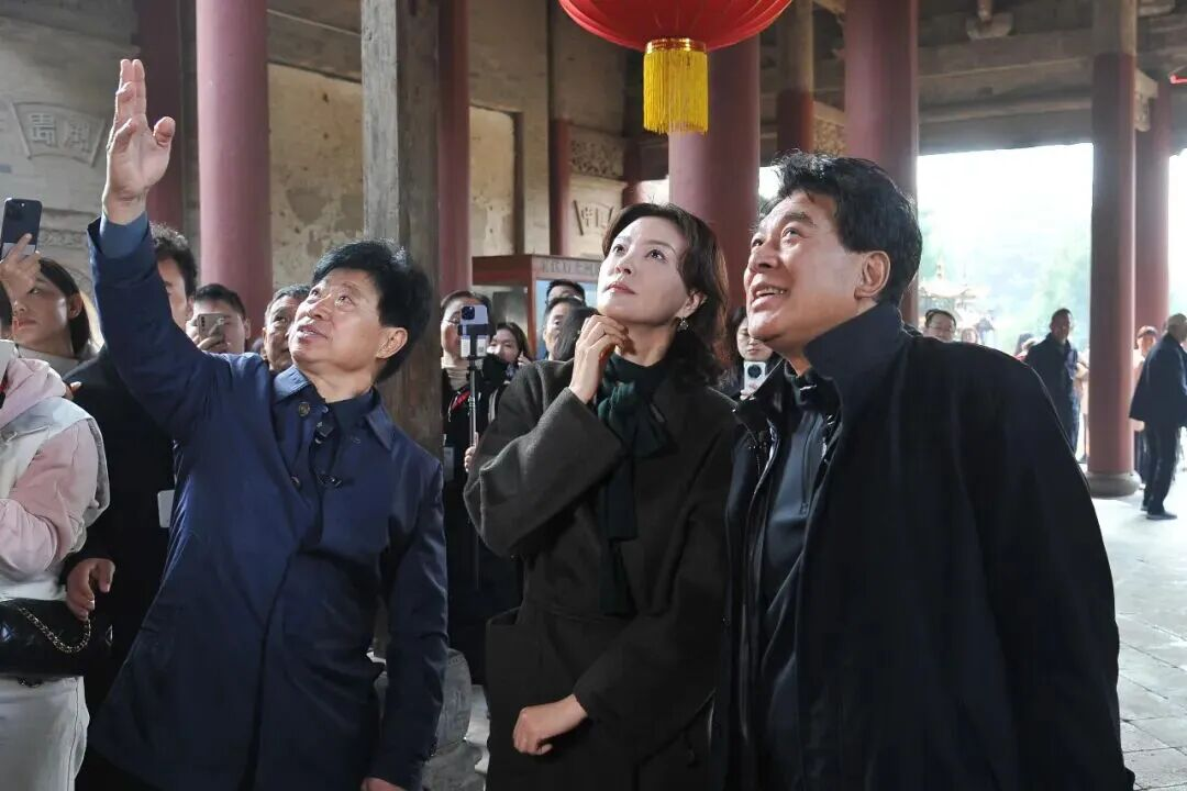 行至秋風(fēng)樓前,現(xiàn)場氛圍更顯莊重(萬榮縣委宣傳部供圖) 這座因漢武帝《秋風(fēng)辭》而聞名的樓閣,自帶歷史厚重感。朱時(shí)茂站在樓前,伴著秋日景致,飽含深情地朗誦起《秋風(fēng)辭》:“秋風(fēng)起兮白云飛,草木黃落兮雁南歸……”悠揚(yáng)的聲線搭配千年樓閣的古樸意境,瞬間將網(wǎng)友帶入漢代文人登高抒懷的場景,直播間內(nèi)“太有感染力了”“終于讀懂《秋風(fēng)辭》的韻味”等評(píng)論刷屏。 隨后,“探訪團(tuán)”登上秋風(fēng)樓,逐層講解樓體的十字歇山頂結(jié)構(gòu)、七踩斗拱工藝,以及樓內(nèi)珍藏的歷史碑刻,讓網(wǎng)友全方位領(lǐng)略這座古樓的建筑價(jià)值與文化內(nèi)涵。