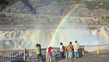 12月3日,游客在吉縣黃河壺口瀑布欣賞“雙彩虹”景觀。初冬時節(jié),受上游水庫調(diào)節(jié)放水影響,黃河壺口瀑布水量增大,飛濺的水霧經(jīng)陽光照射,形成季節(jié)特有的“雙彩虹”景觀,吸引了眾多游客駐足觀賞。