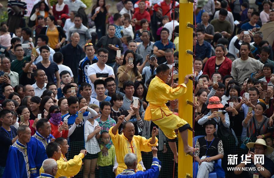 農(nóng)歷十月十五前后,福建西部武平縣各山村陸續(xù)進(jìn)入農(nóng)閑時(shí)節(jié)。按照當(dāng)?shù)仫L(fēng)俗,不同村子各自擇日舉辦民間活動(dòng),其中較有代表性的就是“上刀山”絕技?!吧系渡健苯^技在閩西山村流傳已有數(shù)百年歷史,表演者需光腳順著磨得鋒利閃亮的36把鋼刀,攀登至8米高的杉木柱子頂部,接受長(zhǎng)者祝福,祈求風(fēng)調(diào)雨順、五谷豐登。新華社記者 宋為偉 攝 |