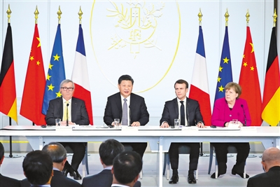 | 3月26日,國(guó)家主席習(xí)近平在巴黎同法國(guó)總統(tǒng)馬克龍一道出席中法全球治理論壇閉幕式。德國(guó)總理默克爾、歐盟委員會(huì)主席容克應(yīng)邀出席。 新華社記者 鞠 鵬攝 |