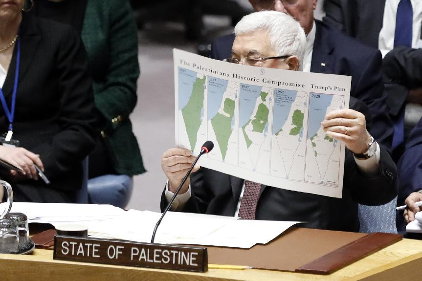 ??2020年2月11日,在位于紐約的聯(lián)合國(guó)總部,巴勒斯坦總統(tǒng)阿巴斯在安理會(huì)中東局勢(shì)和巴勒斯坦問題公開會(huì)上手持地圖發(fā)言。 新華社記者 李木子 攝