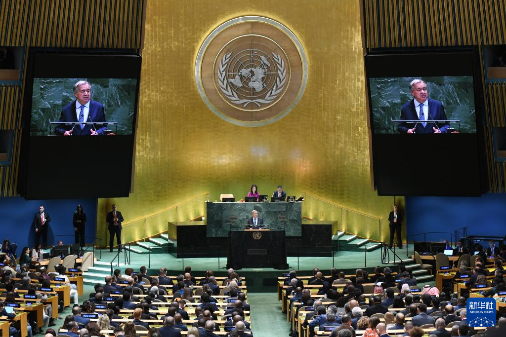 ??9月23日,在位于紐約的聯(lián)合國(guó)總部,聯(lián)合國(guó)秘書長(zhǎng)古特雷斯在第80屆聯(lián)合國(guó)大會(huì)一般性辯論開幕式上致辭。新華社記者李睿攝