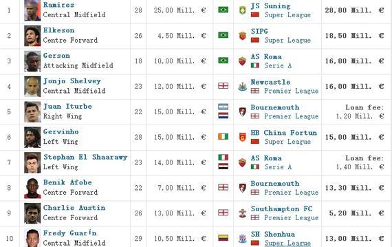 截至目前,中國(guó)俱樂部球員轉(zhuǎn)會(huì)費(fèi)(含轉(zhuǎn)入及轉(zhuǎn)出)排名前10位的分別是拉米雷斯(2800萬歐元)、埃爾克森(1850萬歐元)、熱爾維尼奧(1500萬歐元)、高拉特(1500萬歐元)、保利尼奧(1400萬歐元)、登巴巴(1300萬歐元)、瓜林(1200萬歐元)、吉安(1200萬歐元)、畢津浩(1114萬歐元)、阿蘭(1110萬歐元),1100萬歐元轉(zhuǎn)會(huì)費(fèi)的球員進(jìn)不了前10位,這在一年之前是不可想象的。而像格烏瓦尼奧(1100萬歐元)、張鷺(980萬歐元)、孫可(920萬歐元)、巴里奧斯(850萬歐元)、吉爾(850萬歐元)、孔卡(820萬歐元)、奧古斯托(800萬歐元)、蒙蒂略(750萬歐元)、迪亞曼蒂(690萬歐元)都被擠出了前10位。