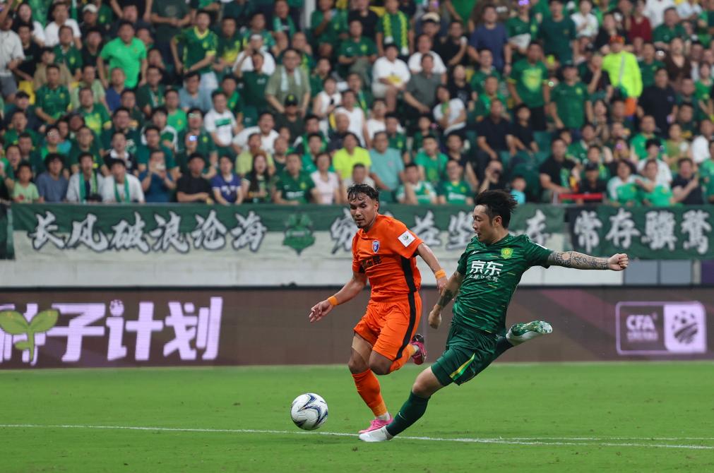 8月20日,北京國安隊球員張稀哲(右)在比賽中射門。新華社記者 胡星宇 攝
