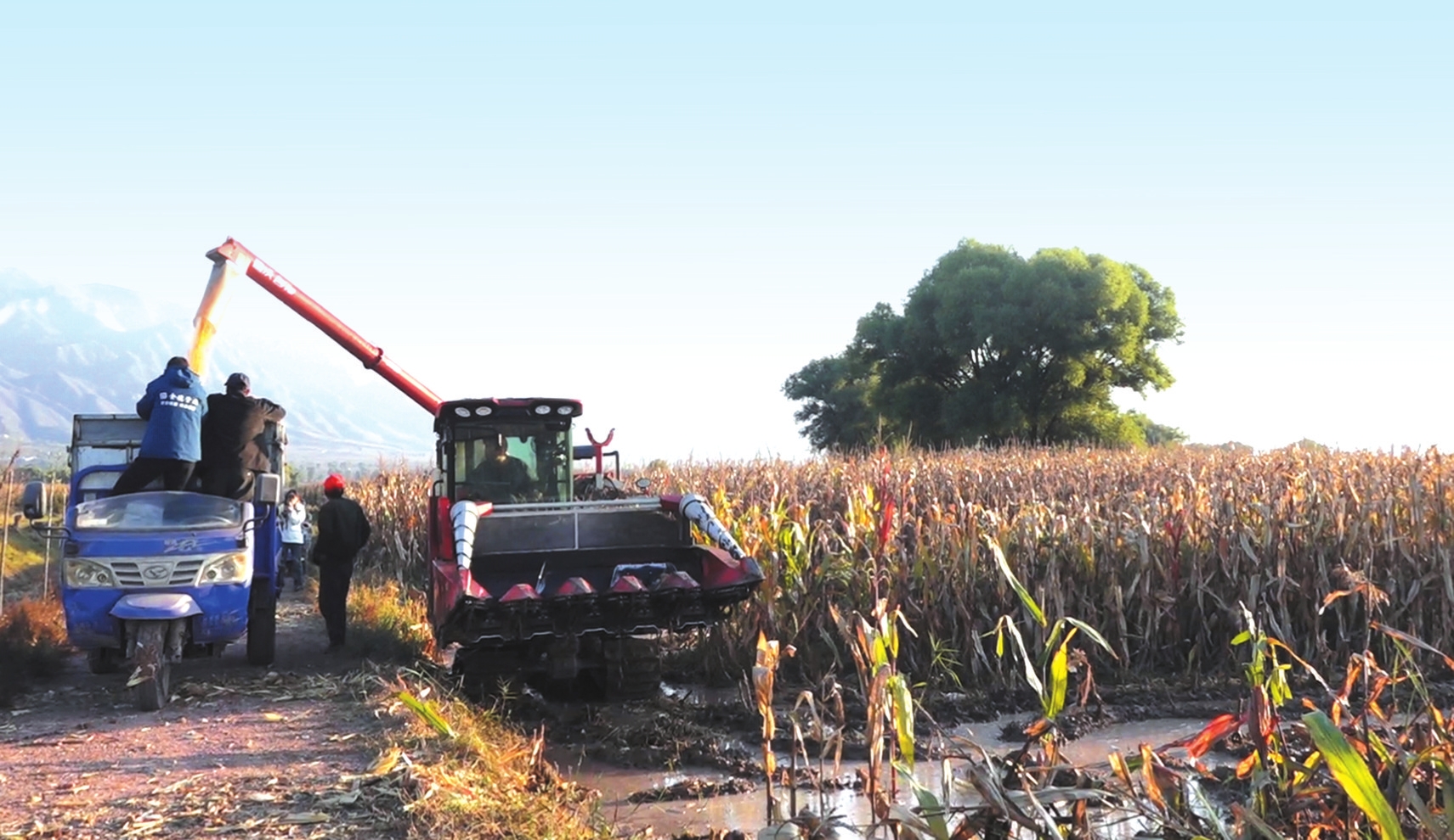 “突突”的引擎聲在濕漉漉的玉米地里轟鳴,來(lái)回穿梭中,金色的玉米在“吞吐”下脫粒,隨后如溪流般源源不斷地傾瀉而出,精準(zhǔn)地落入一旁等候的運(yùn)輸車(chē)廂內(nèi),瞬間堆起了一座座豐收的小山。