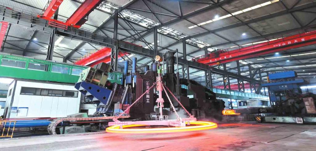 在山西天寶科工股份有限公司,下料、鍛造、機(jī)加工等車間機(jī)器設(shè)備高效運(yùn)轉(zhuǎn),工人們?cè)诟髯詬徫簧厦χs制海內(nèi)外風(fēng)電法蘭訂單。