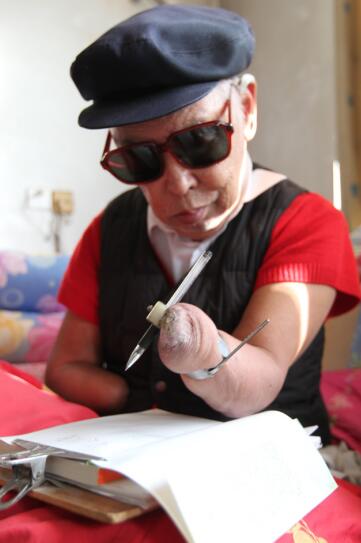 用嘴含筆寫,殘臂夾筆(抱臂)寫,鐵圈套筆寫。整整7年??喟究鄬懥?年,反復修改了7遍。2000多個日日夜夜,父親翻爛了四本字典,很多時候,胳膊翻書不方便,他就用嘴唇翻,用舌頭翻。用掉半噸稿紙,終于在1996年7月,出版了33萬字的自傳體小說《極限人生》。