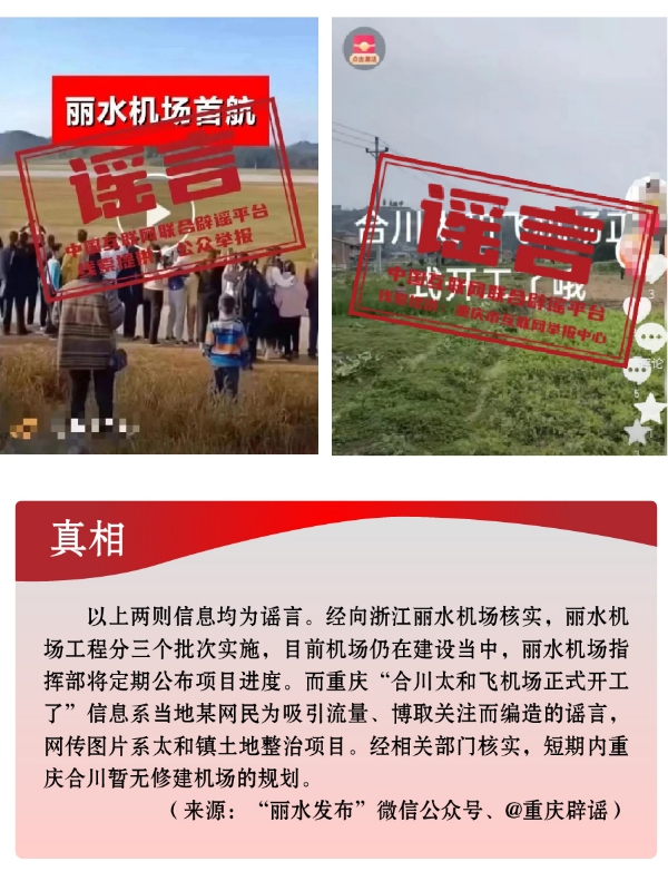 搭蹭熱點散播民生類謠言,渲染焦慮。3月,全國兩會召開,“民生清單”熱度高?!按赫小薄按河巍钡葧r間節(jié)點,有關招工就業(yè)、疫病傳染等內(nèi)容也成為個別網(wǎng)民博眼球的素材。一些個人或自媒體歪曲甚或虛構(gòu)事實,編造散布社會民生謠言,引發(fā)公眾不必要的焦慮。如,別有用心者惡意虛構(gòu)事實,發(fā)布“重慶80%的工廠暫停招聘”“湖南郴州疫情卷土重來”等虛假信息,渲染負面情緒、徒增公眾憂慮、擾亂社會秩序;還有人為吸引流量、博取關注,根據(jù)主觀臆想,采取移花接木等手段,散播“京滬高速公路停止收費”“浙江麗水機場已建成投用并首航”“重慶合川太和飛機場正式開建”等涉重大基礎設施建設項目的假消息,誤導公眾認知,擾亂群眾交通出行秩序。