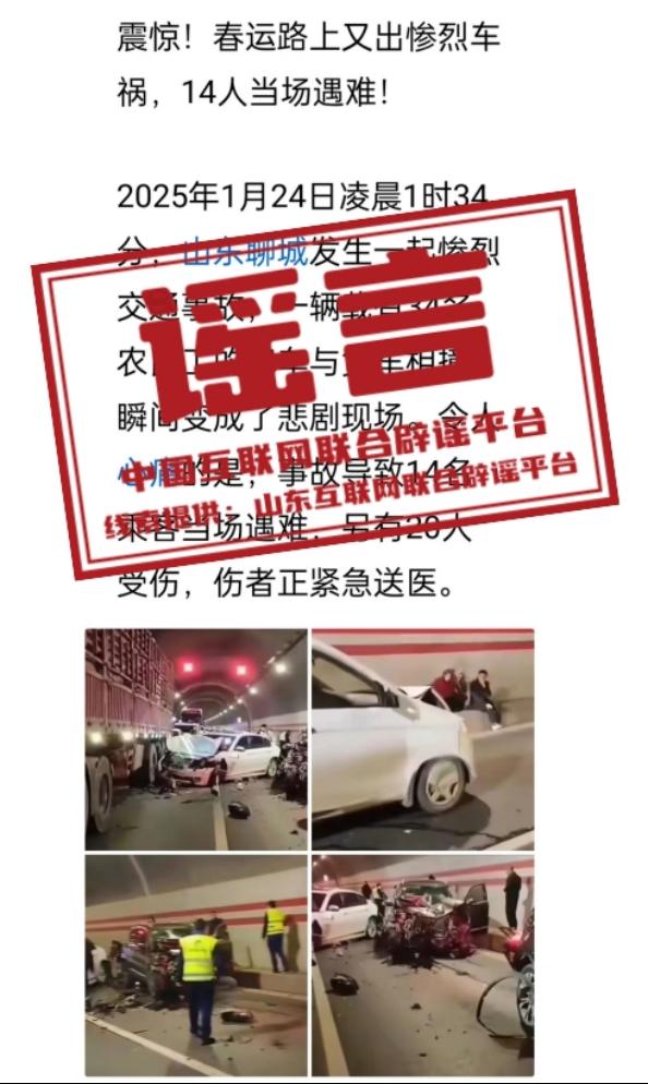 真相:近日,有網(wǎng)民在網(wǎng)絡(luò)平臺(tái)發(fā)布一則“山東聊城一隧道內(nèi)發(fā)生多車相撞”的信息,稱“現(xiàn)場(chǎng)多車發(fā)生嚴(yán)重碰撞,場(chǎng)面慘烈,群眾滯留”,引發(fā)關(guān)注。經(jīng)當(dāng)?shù)鼐胶藢?shí),山東省聊城市從未發(fā)生過(guò)類似交通事故,該信息內(nèi)容純屬虛假編造。經(jīng)查,網(wǎng)民褚某某和韓某為博取關(guān)注、吸引流量,將外省市發(fā)生交通事故的圖片視頻移花接木,稱“聊城發(fā)生交通事故”并憑空捏造傷亡人數(shù),造成不良影響。目前,二人已被公安機(jī)關(guān)依法打擊處理。(來(lái)源:山東互聯(lián)網(wǎng)聯(lián)合辟謠平臺(tái)、聊城市網(wǎng)上辟謠平臺(tái))