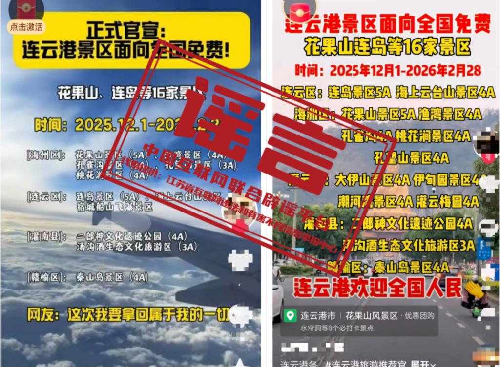 真相:近期,網(wǎng)傳連云港景區(qū)“2025年12月1日至2026年2月28日面向全國免費”。經(jīng)向連云港文旅部門核實,該信息不實。“連云港市文廣旅局官微”微信公眾號2025年11月21日發(fā)布的《連云港最新景區(qū)門票優(yōu)惠政策來啦!》中提到,近期,連云港市旅委辦已出臺“1+1+N(1個“免費開放月”、1個“免費開放周”及不少于5天的“免費開放日”)+淡季優(yōu)惠”的組合式景區(qū)門票政策。這項政策覆蓋全年,各景區(qū)實行“錯峰免費”“淡季優(yōu)惠”“月月驚喜”的精準惠民新玩法,避免以往免票集中在淡季,受氣候等因素影響導致游覽體驗不佳問題,讓游客在任何季節(jié)都能享受免費觀景和舒適的旅游體驗。(來源:@連云港市互聯(lián)網(wǎng)舉報中心 )