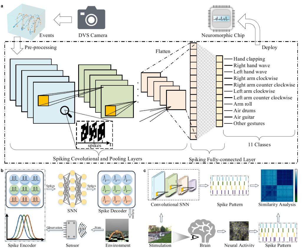 李國齊介紹,傳統(tǒng)脈沖神經(jīng)網(wǎng)絡(luò)框架更多地關(guān)注生物可解釋性,并不支持自動(dòng)微分,無法充分利用GPU的大規(guī)模并行計(jì)算能力,也缺乏對(duì)神經(jīng)形態(tài)傳感器和計(jì)算芯片的支持。“驚蟄”框架很大程度上解決了上述問題,支持神經(jīng)形態(tài)數(shù)據(jù)處理、深度脈沖神經(jīng)網(wǎng)絡(luò)構(gòu)建和神經(jīng)形態(tài)芯片部署等多項(xiàng)功能。