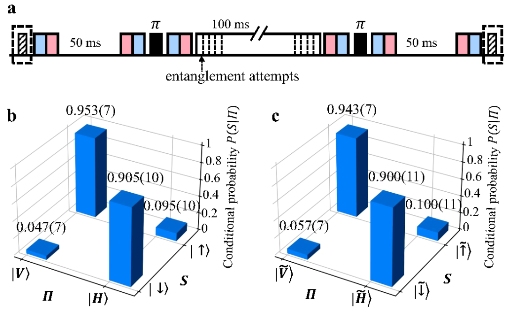 實(shí)驗(yàn)發(fā)現(xiàn),通過此方法制備出的通訊比特,可在數(shù)百毫秒的時(shí)間內(nèi)生成離子-光子糾纏;通過自旋回波方法可延長(zhǎng)存儲(chǔ)比特的存儲(chǔ)壽命,實(shí)現(xiàn)相干時(shí)間達(dá)到秒量級(jí)的存儲(chǔ)量子比特。通過比較有無離子-光子糾纏生成操作時(shí)存儲(chǔ)比特的保真度變化,研究人員證實(shí)了兩種量子比特之間低于實(shí)驗(yàn)精度的串?dāng)_誤差,從而實(shí)現(xiàn)了無串?dāng)_的量子網(wǎng)絡(luò)節(jié)點(diǎn)。