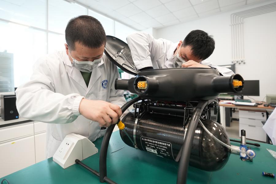 3月28日,科研人員在為無人機(jī)裝配高比能氫混動力電源。新華社記者 潘昱龍 攝