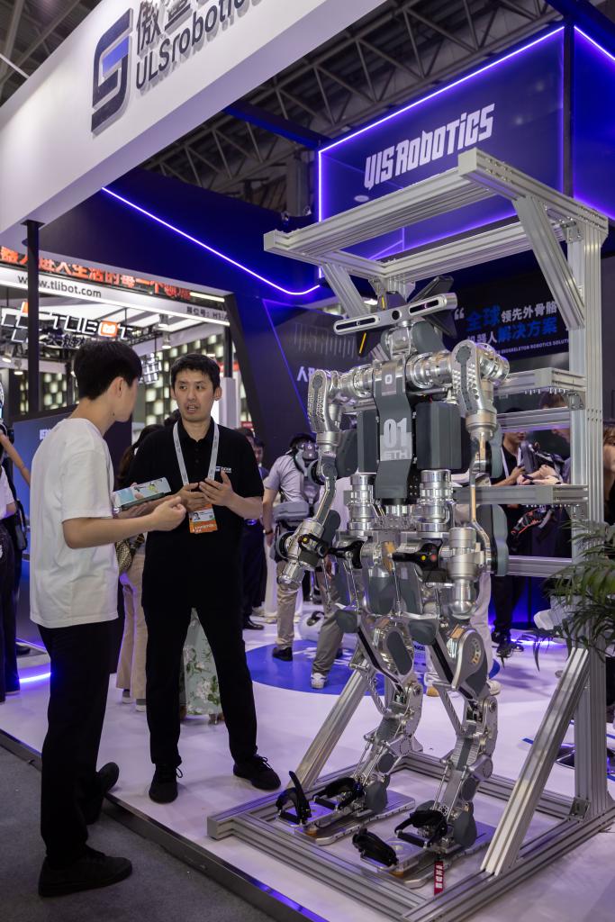 “這臺人形機器人可實現(xiàn)人形與外骨骼雙模式工作,結(jié)合力控與感知能力、大模型人工智能訓(xùn)練,完成在礦山、電力、應(yīng)急等野外復(fù)雜環(huán)境中的作業(yè)、任務(wù)等。”上海傲鯊智能公司市場總監(jiān)張華說。
