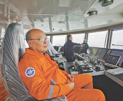 “夢(mèng)想”號(hào)指揮部主要負(fù)責(zé)人周昶(前)在動(dòng)力控制室查看船上情況。 中國(guó)地質(zhì)調(diào)查局宣傳教育中心供圖