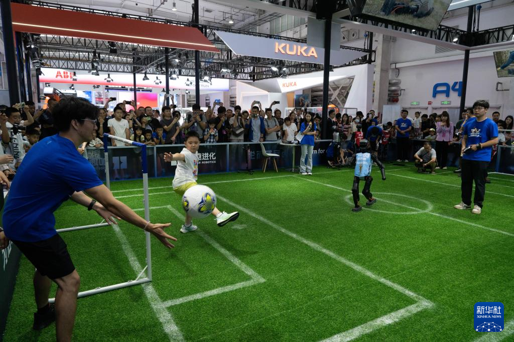 8月8日,觀眾在2025世界機器人大會上與機器人踢足球。新華社記者 謝晗 攝