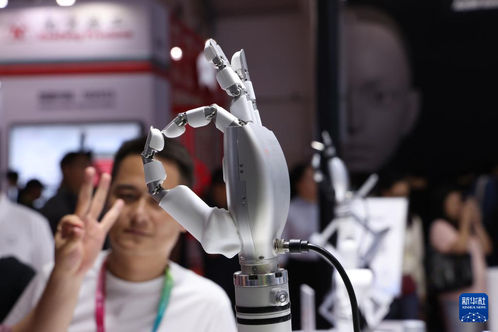 8月8日,觀眾在2025世界機器人大會上觀看展示的一款靈巧手。新華社記者 金立旺 攝