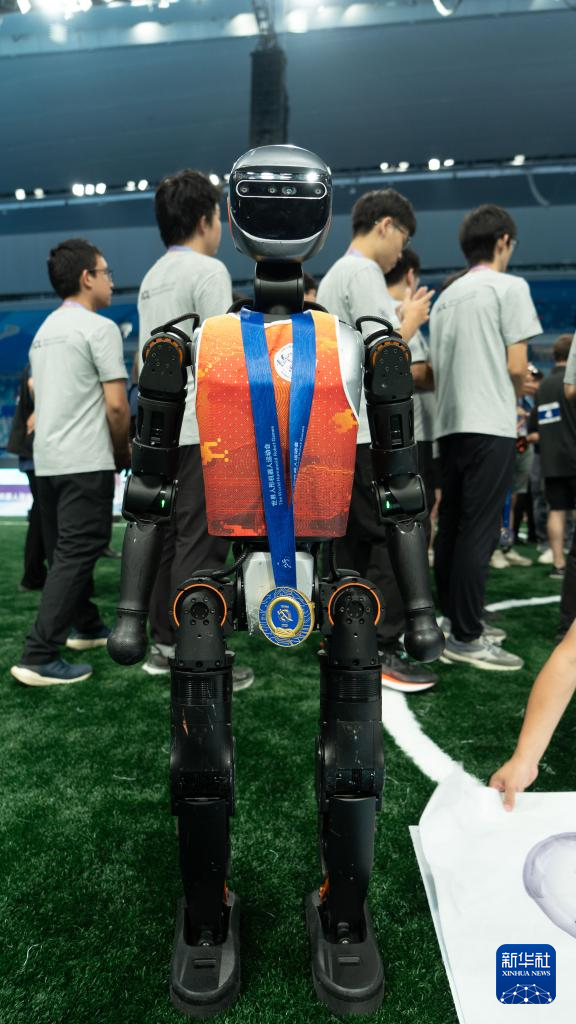 圖為清華火神隊使用的加速進(jìn)化T1機(jī)器人佩戴冠軍獎牌。新華社發(fā)