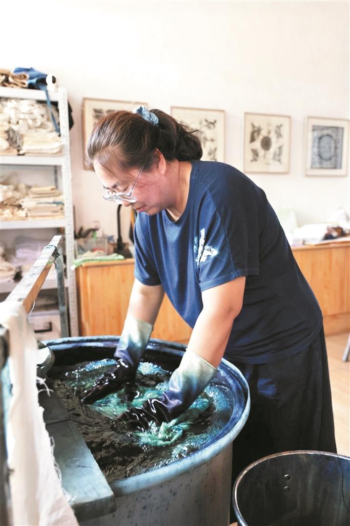 然而,當(dāng)夢想照進(jìn)現(xiàn)實,前行的路總是充滿坎坷。由于前期投入大,入不敷出的經(jīng)濟(jì)狀況讓她犯了難,為了支撐店鋪運營,她不僅賣了房子,還貸了款?!半m然丈夫不支持,但是好在兒子很支持,最讓我欣慰的是,他常驕傲地跟別人介紹,‘這是我媽媽染的’‘我媽媽是非遺傳承人’,也正是這些,在我動搖、想要放棄的時候,我選擇堅持下去?!闭f到動情處,趙慧言語滿是幸福。